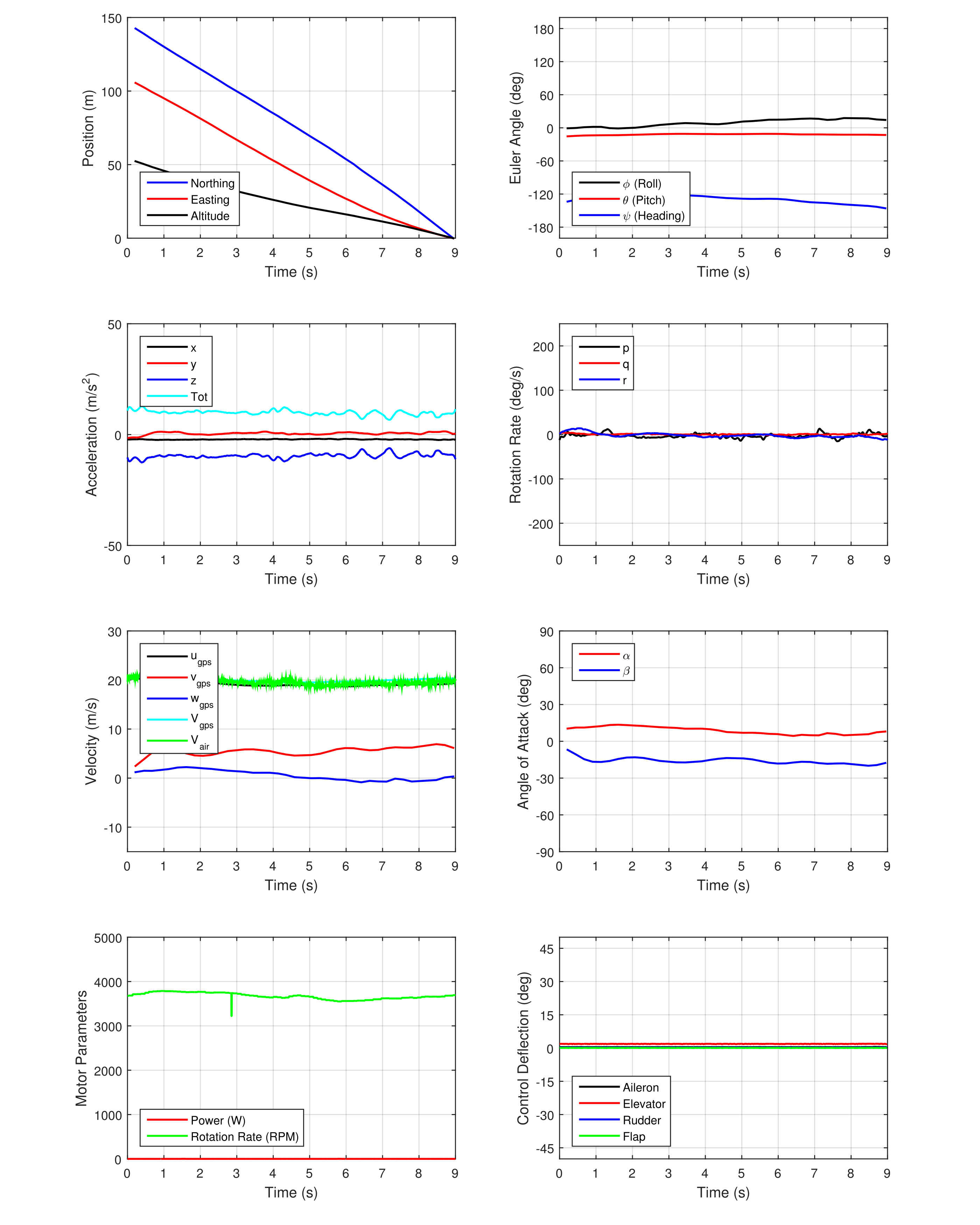 The results visualized below are a subset of the complete data set collected and as such provide a sample representation of what is available. All of the maneuvers shown below, among the rest, are available for download in Dataset Downloads . These datasets include plots of trajectories and time history of state data and the flight data. Maneuvers were performed following the test plan presented in Flight Test Matrix.